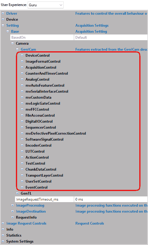 After you've set the interface layout to GenICam (either programmed or using ImpactControlCenter), all GenICam controls of the device are available.
