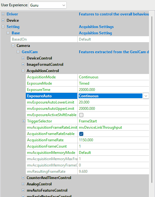| AcquisitionFrameRate | acquisitionFrameRate | Controls the acquisition rate (in Hertz) at which the frames are captured. Some cameras support a special internal trigger mode that allows more exact frame rates. This feature keeps the frame rate constant to an accuracy of +/-0.005 fps at 200 fps. This is achieved using frames with a length difference of up to 1 us. Please check in the sensor summary if this feature exists for the requested sensor. |