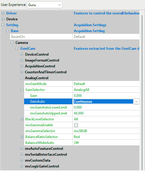 | GainAuto[GainSelector] | gainAuto | Sets the automatic gain control (AGC) mode. |
