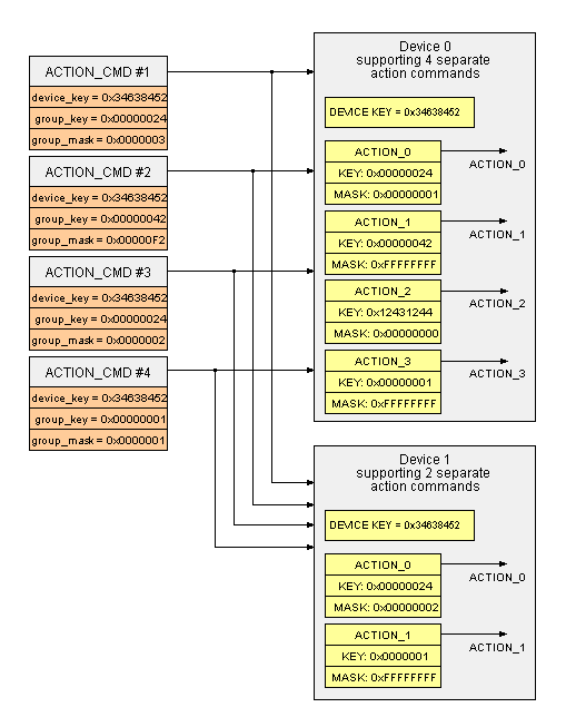 For instance, let's assume the software trigger of Device 0 can only be associated to its ACTION_3 and that the software trigger of Device 1 can only be associated to its ACTION_1. And the Action command supports to trigger the same functional action provided that their respective action group key and masks are set in order to meet the conditions from the previous list.