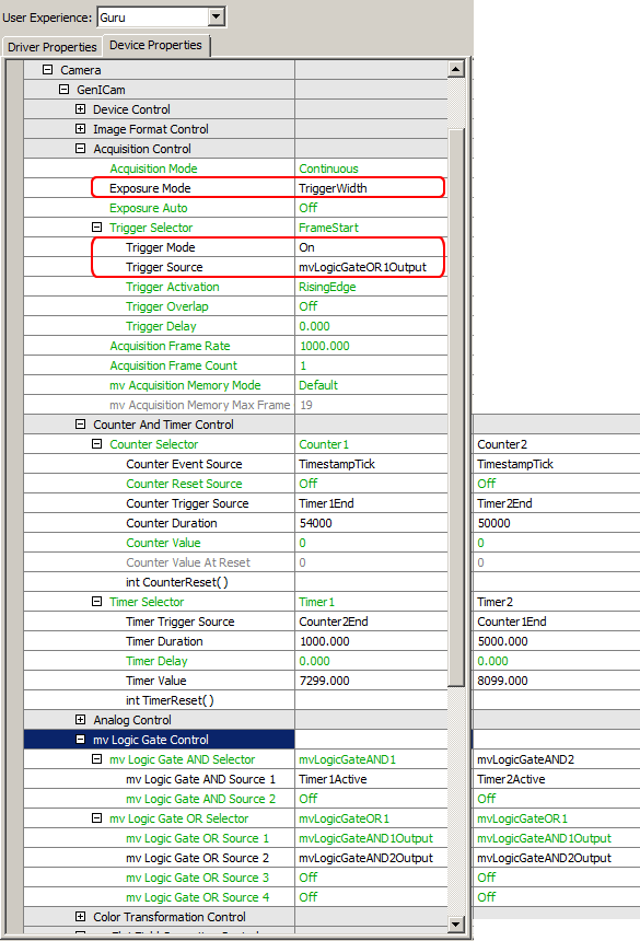 We take 55 ms to be sure. Now, as different exposure times we take 1 ms (Timer1) and 5 ms (Timer2). To get the 55 ms, we have to add 54000 us (Counter1) and 50000 us (Counter2).