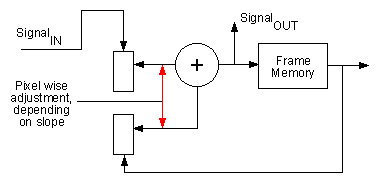This method is well known and is used in the same or a similar way in all flat screen televisions. The amount of de-noising can be set with the slope factor: the smaller the value, the greater the feedback and therefore the de-noising but also the motion blur in the image: