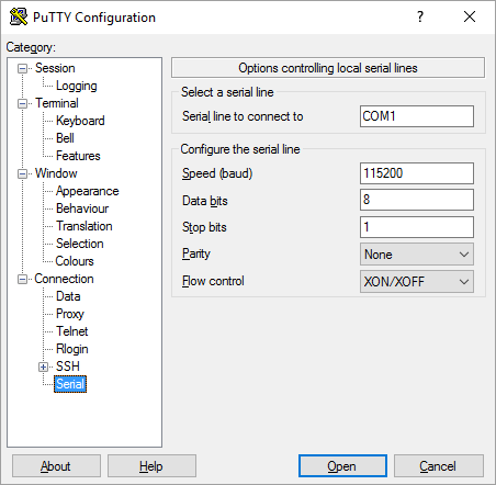 Figure 2: PuTTY - Setting up the serial interface you will see the test message: