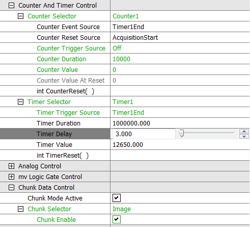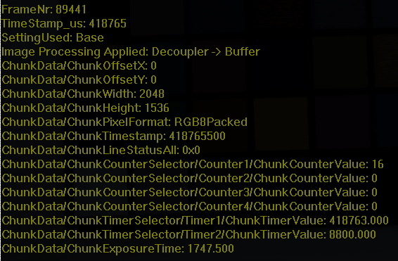 An example of the chunk data attached to the image can be seen below. The timestamp is in µs and Counter1 counts the reset pulses, in this case itself generated by the camera via Timer1.