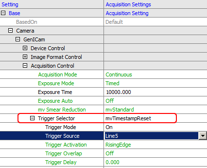 The device would then maintain their timestamp-differences over long times and stay synchronized. The initial difference between the timers - before the PPS was used - remains however. If you aim to eliminate that as well, you can use the mvTimestampReset up front with the same PPS input signal. In an application this can be configured like this (C# syntax):