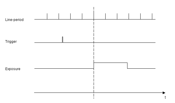 With the Pregius global shutter sensors of the 2nd, 3rd, and 4th generation from Sony, it is possible to start the exposure on the trigger. There is no latency and no jitter. The length of exposure is also not based on the line-period, because the sensor does not depend on it in this mode. The minimum exposure time is limited by several line periods though. Because during readout the sensor obviously requires the line-periods this mode is only supported in non-overlapped exposure and readout: